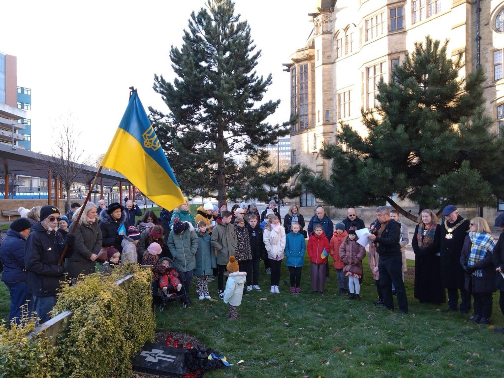 The Ukrainian community gathered at the Holodomor plaque in Bradford city centre with children from the Ukrainian School Bradford reading poems