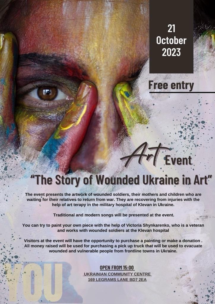 Дякуєм українському клубу міста Брадфорд за підтримку проекту, а також всім , хто причетний до події. Завдяки вам було зібрано 775 фунтів, які додаються до збору на пікап. Безмежно дякуєм кожному, хто прийняв участь у організації, підтримав донатом або купив картину- частину пораненої України, що відновлюється завдяки арт-терапії та рухається до перемоги. Вже скоро спільними зусиллями ми купим пікап, який буде рятувати життя нашим захисникам на передовій.