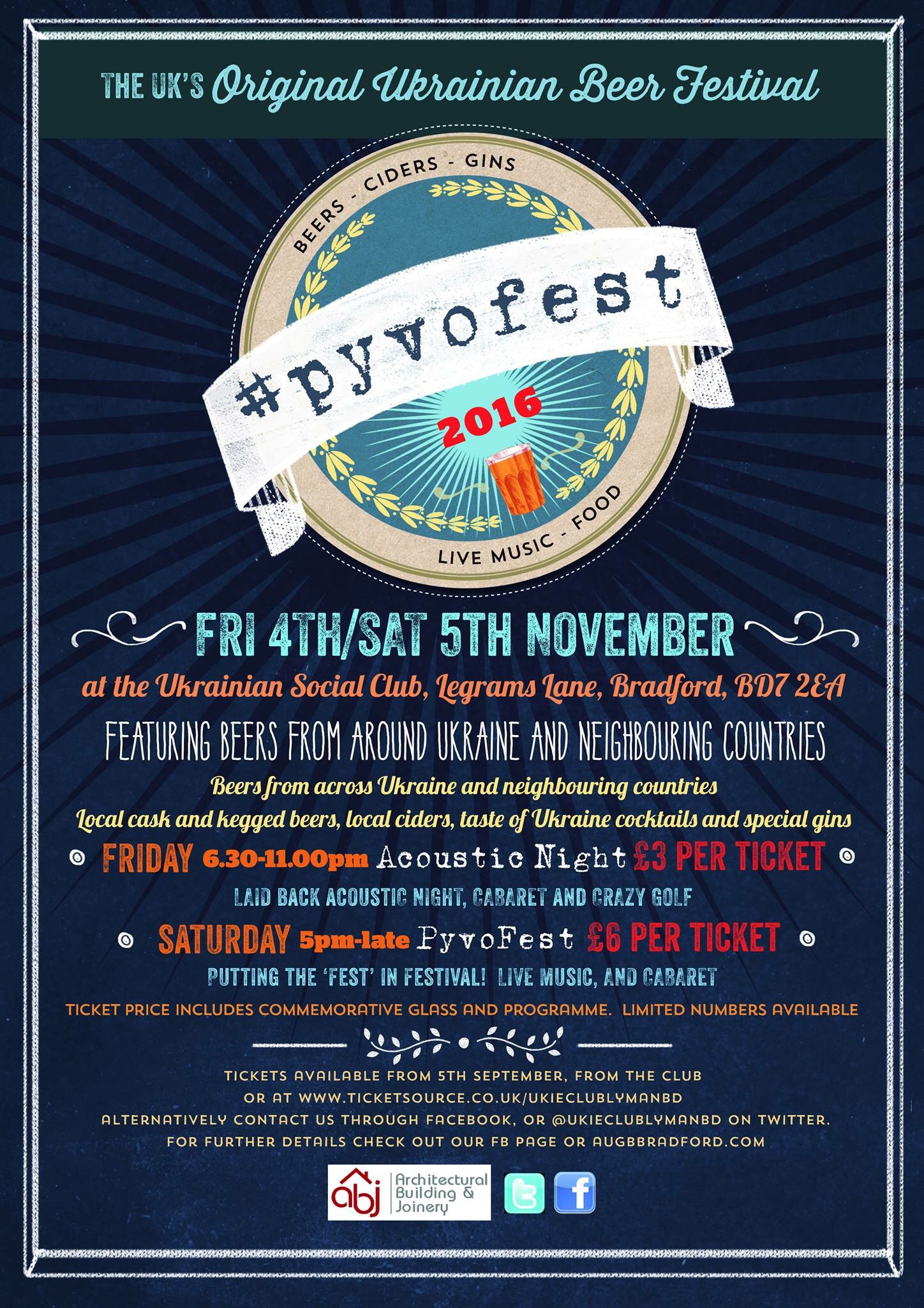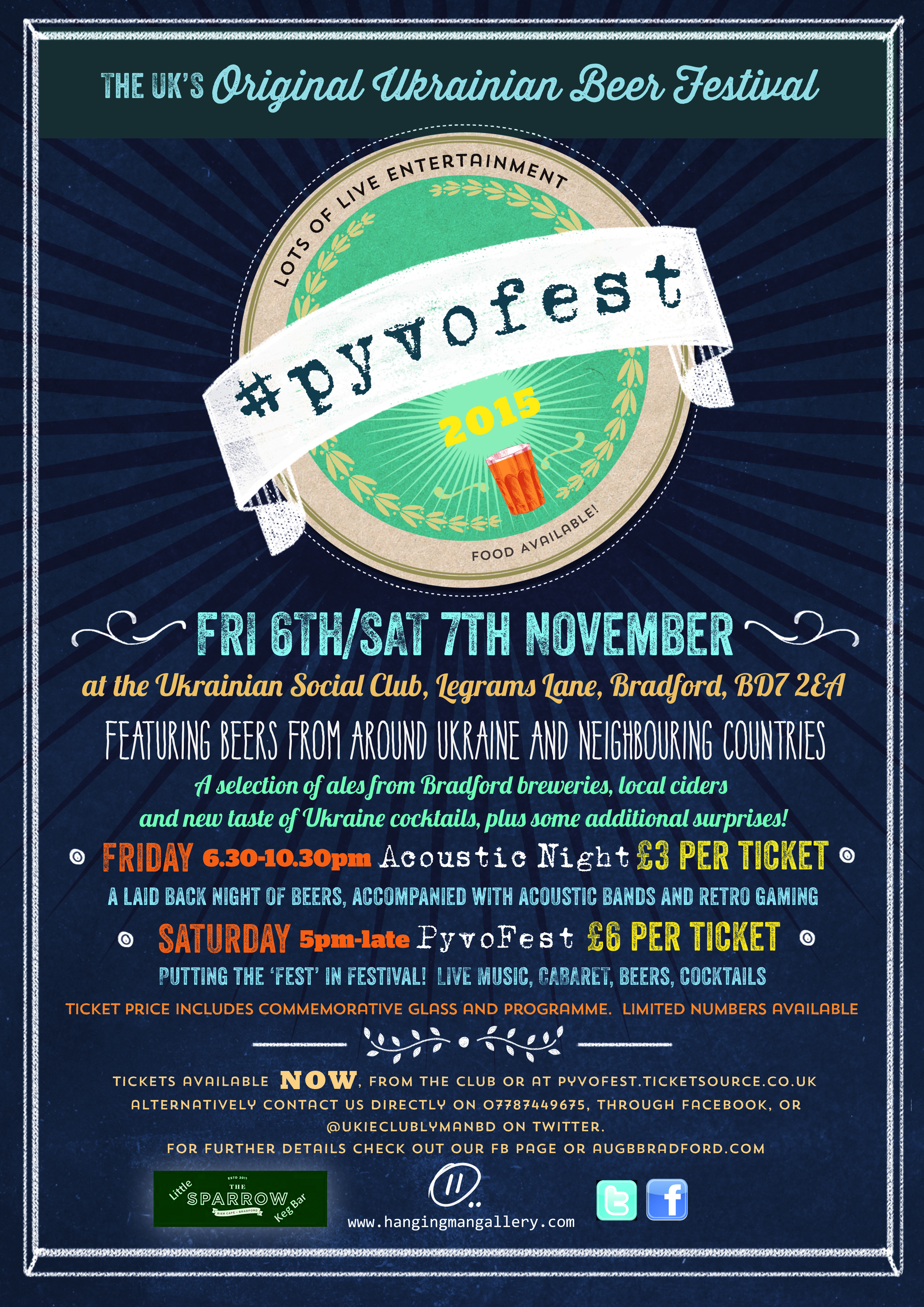 Our Ukrainian beer festival returns! One venue, 2 nights, 6 live bands plus a cabaret act, 50+ beers and ciders, plus taste of Ukraine inspired cocktails, a secret bar and Ukrainian food.Beers from across Ukraine, including for the first time ever in the UK, Ukrainian craft beer from Pravda Beer Theatre in Lviv, and the first ever Ukrainian draft beer to be served in the UK. Come and make history. There’s also beers from Ukraine’s neighbours, Estonia, Lithuania, Latvia, Poland and Czech kegged beer served up by The Sparrow. Local breweries are also represented, with a Bradford Breweries cask tent.Saturdays session has sold out, but tickets for Fridays acoustic session featuring Mike Taylor, the Coventry Kozaks and the amazing Jen Armstrong are available (£3 includes commemorative glass and programme) at the club, The Sparrow or http://www.ticketsource.co.uk/pyvofest Get your ticket now to avoid disappointment!