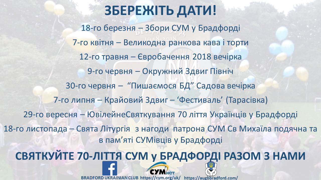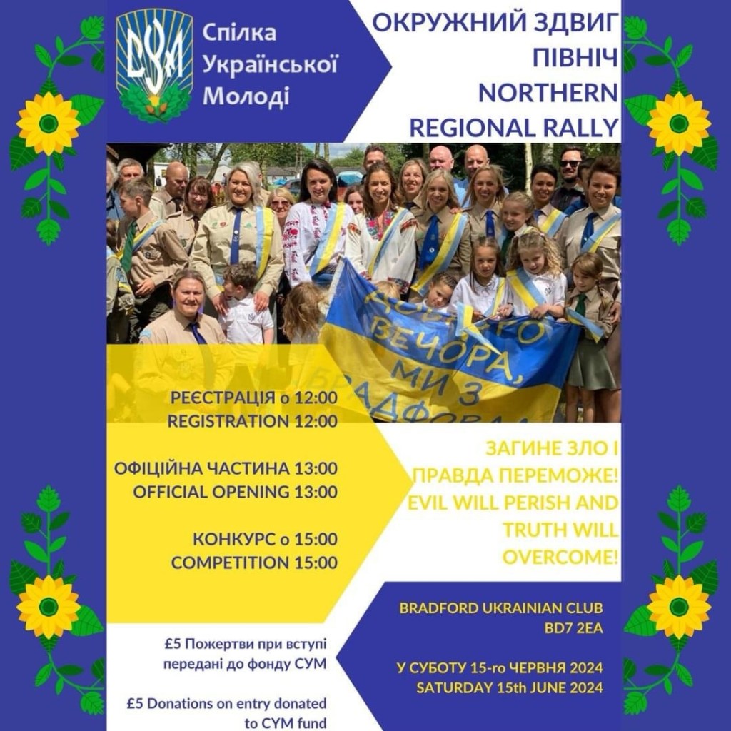 Please be informed that the District Zdvig SUM “North”, will be held on Saturday, June 15 at the Ukrainian Public Center of the Sub Division in Bradford – 169 Legrams Lane, Bradford BD7 2EA.