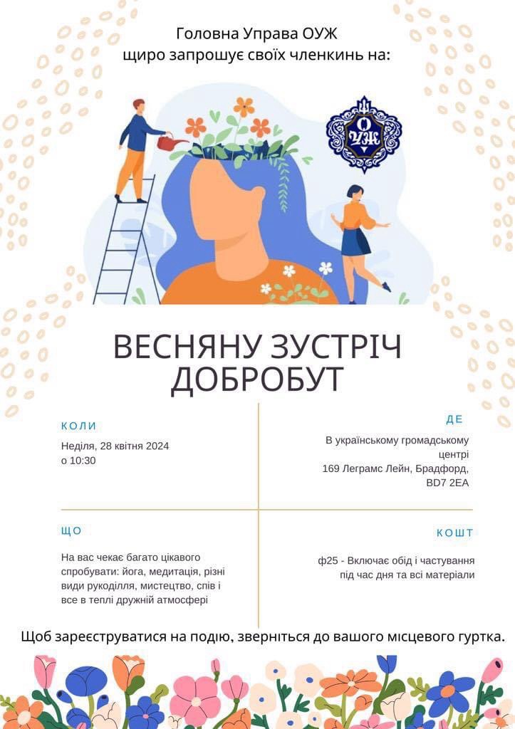 Управи Відділу СУБ, та Товариського Клюбу «Лиман» у Брадфорді повідомляють своє членство та все українське громадянство, що в неділю 30-го березня 2025 року відбудуться:
