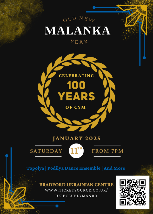 This year, our Malanka will be celebrating 100 years of CYM, the Ukrainian Youth Association. Founded in 1925, CYM/the UYA organises, nurtures and educates youth in the spirit invoked by the ideals “God and Ukraine”. The Bradford Branch of the UYA was created in 1948 and continues its activities today. Join us to celebrate the new year, and 100 years of CYM in our unique Ukrainian way!