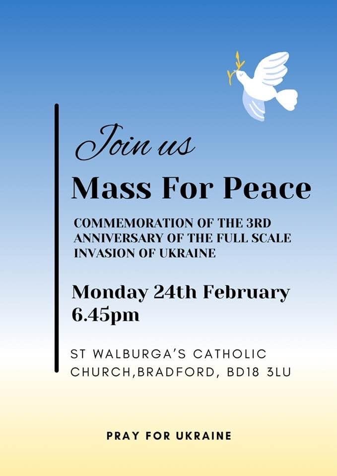 On February 24, 2025, we sadly mark the third anniversary of russia’s full-scale illegal invasion of Ukraine. On this day, a Mass for Peace and remembrance of all those who died as a result of russian aggression will be held at St. Walburga’s church in Shipley. This is a testament to the indomitable strength and resilience of the Ukrainian people.